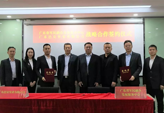 20日,广东省军民融合发展服务中心与广东邑安实业有限公司签订战略合作协议,双方将在安防军警装备军民融合发展方面开展更全面、更深层次的交流与合作。