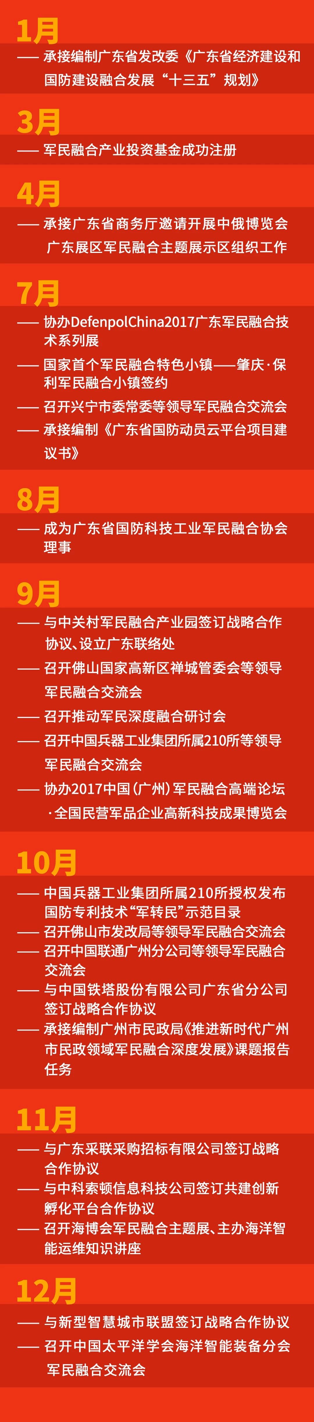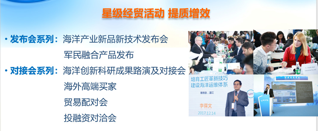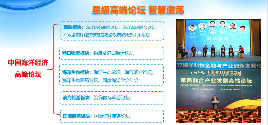展会简介 中国海洋经济博览会(以下简称“中国海博会”)是由国家海洋局和广东省人民政府共同主办的大型经贸会展活动,是我国唯一的国家级海洋产业综合性展会,被誉为“中国海洋第一展”。 2018海博会定于11月22日至25日在湛江市奥体中心举办,全面展示海洋能源、海工装备、生物医药、海洋科技、军民融合发展等最新前沿科技成果。同时举办海洋科技金融与产业创新发展等高端论坛峰会。 为贯彻落实军民融合发展国家战略,搭建海洋领域军民融合交流合作平台,抢抓军民融合战略发展大机遇,本届中国海洋经济博览会特设海洋领域军民融合展,举办海洋军民融合高端论坛活动,并广泛邀请国内外的政府要员,军民融合领域专家、企业领袖、商界精英、媒体记者和采购商等到会参观洽谈、开展对话、加强合作,共享商机。 广东省军民融合发展服务中心诚邀各涉海军民融合单位报名参观、参展。参展展位及搭建免费,展会详情及参观/参展方式见下方内容。 军民两用技术及产品 研究成果应用展示 优质企业风采展示 涉海民参军、军转民交流对接 发布军采项目 海工装备、船舶(船舶、艇类制造及配套) 港口设备(装卸类,辅助设备类、运输) 海洋能源装备(传统能源+新能源:风能、潮汐能) 海洋渔业、水产、生产与加工装备等 海洋创新科技成果:海洋风电、天然气水合物(可燃冰)、海洋公共服务等科研成果 海洋科研院所、高校(产学研):精选创新科研成果及专利技术 海洋监测、测绘、勘探、海水淡化、海洋环保、海洋环境治理 海洋大数据 海洋生物科技 生物制药、医药研发及流通 食品保健 生物化工、工业原料 海洋生物工程、生命科学 星级企业汇聚 免费参展/参观报名方式 参展费用:展位租金免费,标摊搭建免费,特装搭建费用自理 联系人:郑一敏 电话:020-62336329 13380050356 邮箱:78337729@qq.com 意向企业也可关注中心官方微信公众号,回复本人联系电话即有工作人员联系您做意向登记,审核通过后,可免费参展/参观。 广东省军民融合发展服务中心 广东省军民融合发展服务中心为中国保利华南公司发起的非营利性社会组织,于2016年3月经广东省人民政府职能部门批准依法注册登记成立。中心致力于为政府、军队、企业提供研究、咨询、会展、金融和运管服务,推动军转民、民参军、军地深度融合发展。 研究服务 为政府、军队、企事业单位提供战略规划、政策解读、课题研究、论文创作等服务。 咨询服务 为企业规划“民参军”路径,辅导军工资质认证办理和国防专利申请、高新企业认定、政府扶持资金申报办理辅导,为军工单位提供国防专利转移转化服务,促进军民双向转移转化。 会展服务 组织军民融合产业主题展览、会议,提供会前策划、会务保障、媒体宣传等系列服务。 金融服务 设立产业、创投,组织投融对接,为军民融合产业项目提供融资、并购等服务。 运管服务 整合军民融合领域资源,落实产业扶持政策,为政府、企业提供军民融合产业园区(小镇)运营管理服务。 中心2017大事记
